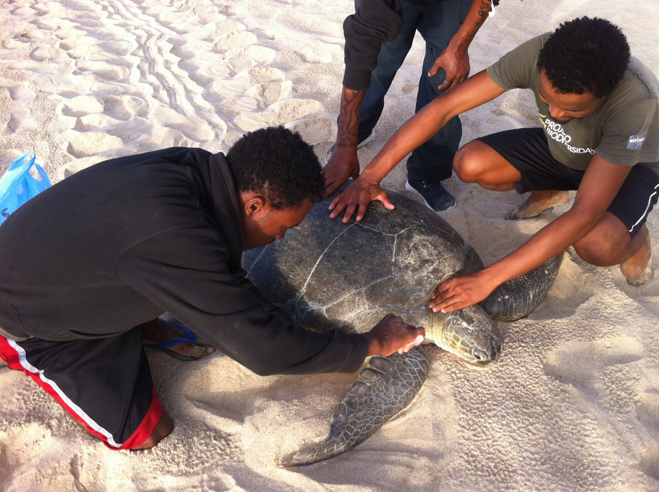 Field researchers tag a green turtle in Cabo Verde. © Projeto Biodiversidade